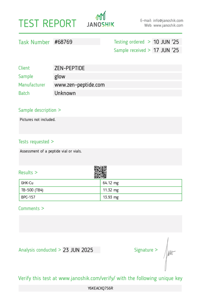 Peptides like GLOW have been studied for their potential biological interactions in various experimental models. In research settings, such substances are utilized to investigate cellular, molecular, or physiological mechanisms under highly controlled conditions. This peptide is not intended for therapeutic, cosmetic, or diagnostic use and should only be handled by qualified researchers with proper authorization and compliance with relevant ethical and regulatory standards.